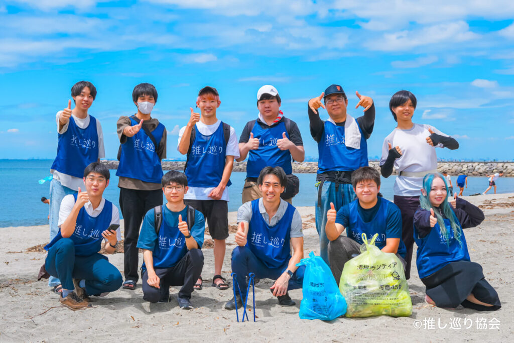 こうして着⼿したのが、月1回の公園清掃です。“アニメの聖地”と“清掃活動で綺麗にすること”とを掛けて、『清地化プロジェクト』と名付けたこの活動は、もう2年以上続いており、なんと千葉市でも毎⽉当協会の仲間が掃除を続けています。この活動には、毎⽉10名ほどの参加者がおり、そのうち3名ほどは初参加の⽅だったりします。2025年9月には、当活動の一環として株式会社JTBとのコラボで、県内外から40名以上が参加して同アニメが舞台となった海岸を清掃する“ビーチクリーン”を開催し、⾷事交流会で盛り上がるなど成功を収めました。