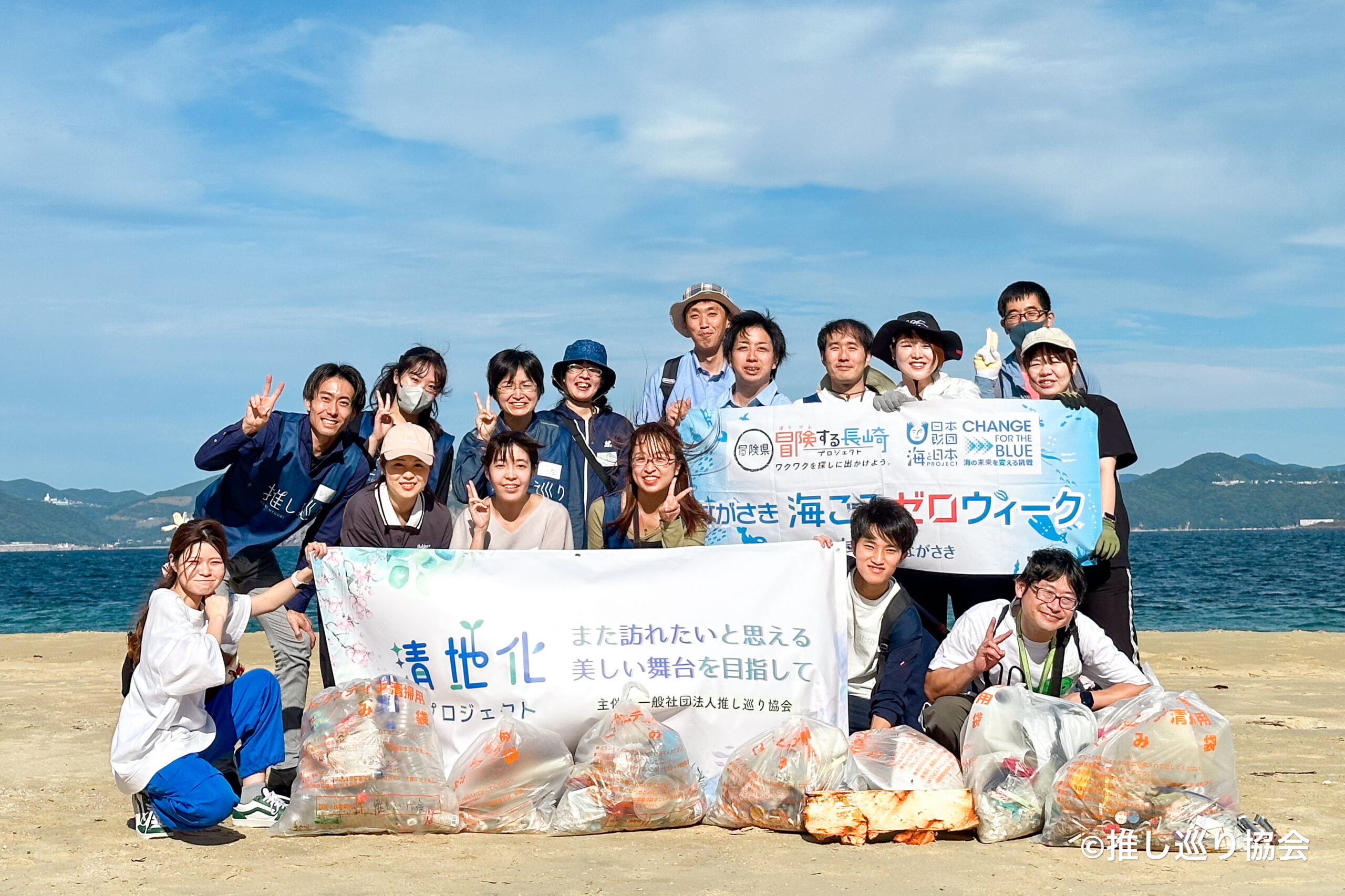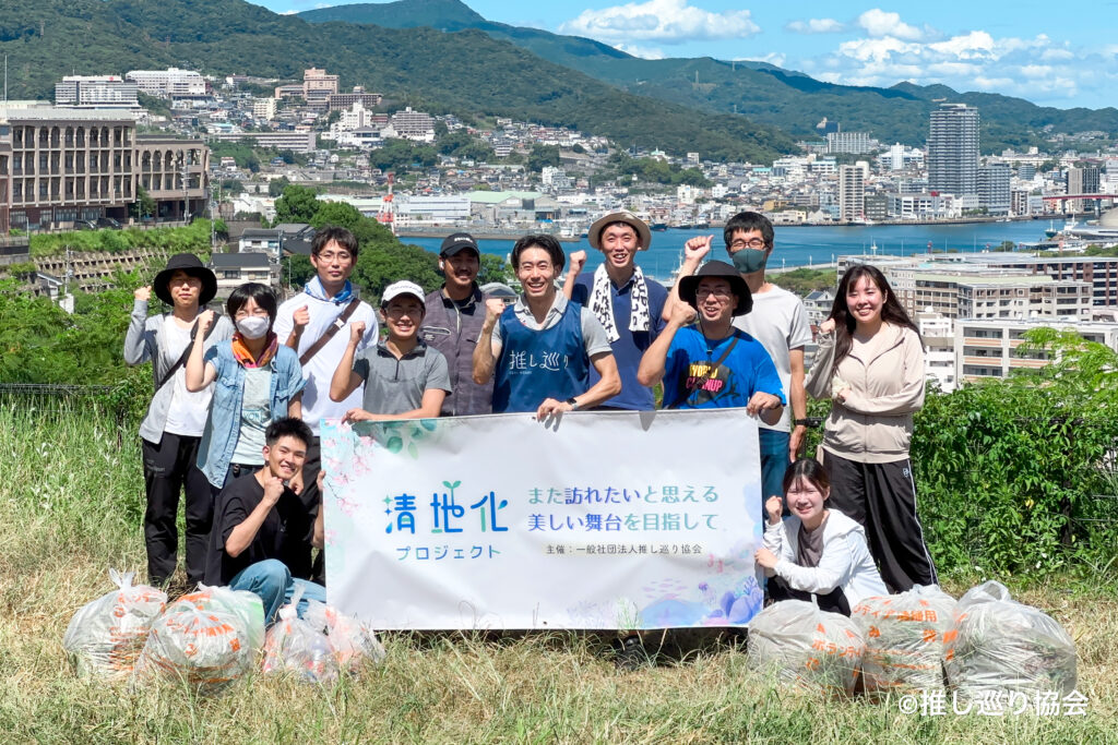 写真展の開催がきっかけとなり、2023年8月に⼀般社団法⼈推し巡り協会を設⽴、起業しました。この時、どのような事業を行っていこうか漠然としているなかで、ひとつブレなかった考えがあります。それは、「所詮自分が思いつくアイデアは、すでに他の誰かが試しているに違いない。その結果、いまの世の中に出ていないのであれば失敗する事業なのか、そもそも需要がないのかのどちらかだ。自分のアイデアが特別だということはありえない。」です。そうして試行錯誤するなか、以前から「県外から⼈が来てほしい!と叫ぶばかりで、受け入れ態勢ができているのか?」という点に疑問があった私は、「ペットボトルや空き⽸・タバコの吸い殻が捨ててある地域に⾏きたいと思うか?」を自問自答していたことを思い出し、「⻑崎に⾏きたい!また来たい!」と思ってもらえるように、地域住⺠とアニメファンが協⼒してアニメの舞台を保全していく活動を始めました。