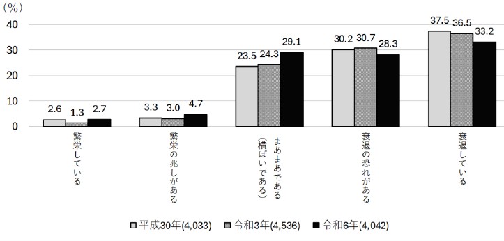 同調査の商店街の景況についてみると、「繁栄している」と「繁栄の兆しがある」、「まあまあである(横ばいである)」が、前回調査(令和3年)比それぞれ1.4ポイント 、1.7ポイント 、4.8 ポイント増加している。一方、「衰退している」と「衰退の恐れがある」は 、3.3 ポイント、2.4 ポイント減少しており、各地の商店街がその存続に奮闘していることがうかがえる。