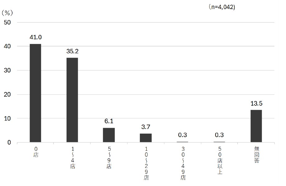 商店街全体(非会員含む)における直近1年間の新規出店数は、「0店」が41.0%と最も多く、次点は「1~4店」の35.2%と、新たな店舗が続々と出店している状況ではないようだ。