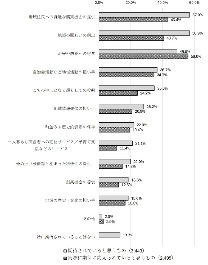 商店街の役割で“期待されていると思うもの”は、「地域住民への身近な購買機会の提供」が57.0%でトップ。以下「地域の賑わいの創出」(56.9%)、「治安や防犯への寄与」(49.0%)の順。