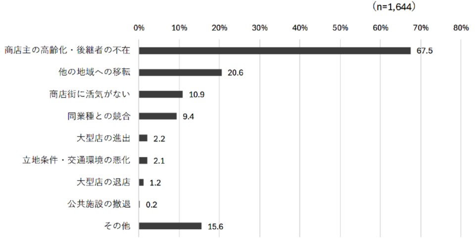 商店街における空き店舗のうち、直近1年間に退店(廃業)した理由をみると、「商店主の高齢化・後継者の不在」が7割近く(67.5%)と、次点の「他の地域への移転」(20.6%)を大きく引き離してトップ。以下「商店街に活気がない」(10.9%)、「同業種との競合」(9.4%)となっており、一般企業と同様、商店街の店主も高齢化に伴う後継者問題に悩まされているのが見て取れる。