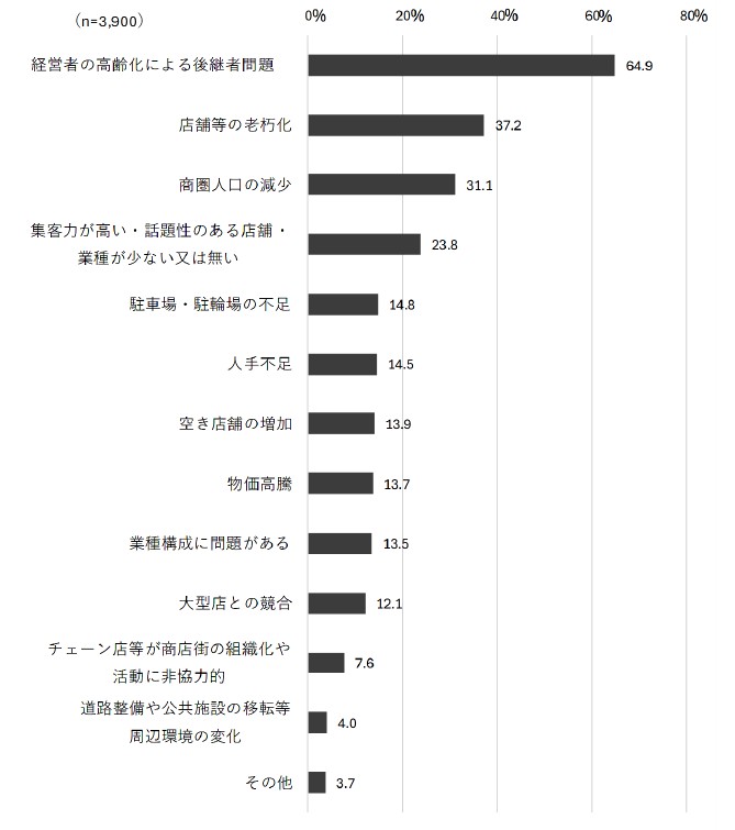 商店街の問題については、「経営者の高齢化による後継者問題」が64.9%で最多と、これも次点の「店舗等の老朽化」(37.2%)」を大きく引き離した。3番目は「商圏人口の減少」(31.1%)となっている。