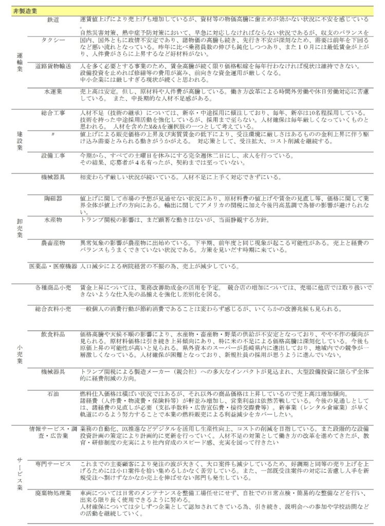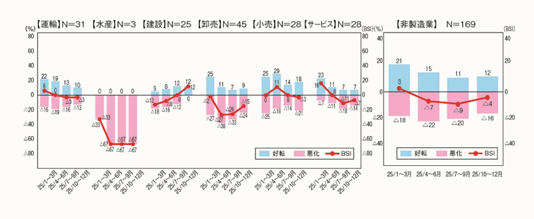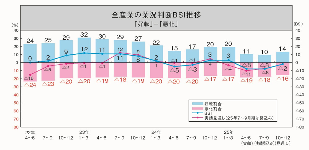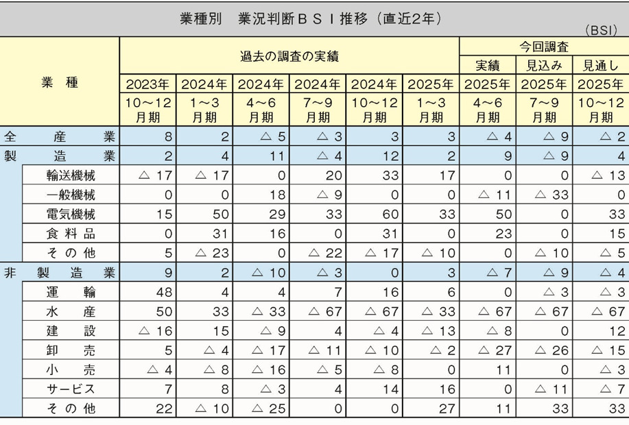 〇全産業の業況判断BSIをみると、原材料の高止まりや人手不足、猛暑の影響などから、2025年4~6月期実績および、足もと7~9月期(実績見込み)いずれも△8と横這い。一方、先行き10~12月期は、「ながさきピース文化祭2025」の開催に伴い観光客が増えることへの期待などから△2に持ち直す見通し。