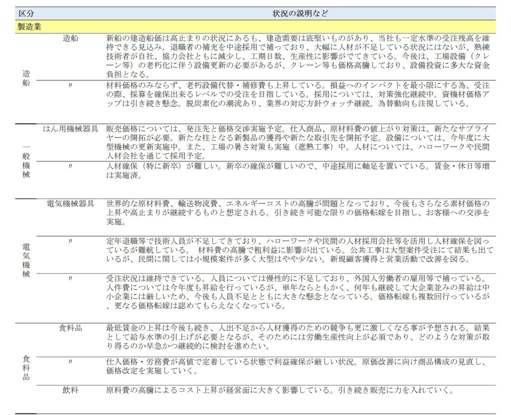 回答企業からは、「原材料、仕入単価上昇分は、徐々に販売価格へ転嫁できているが、人手不足による生産キャパが低い状態が続いている」(電気機械)、「燃料価格は若干の下落傾向も見えるが、安い価格とはいえない水準。賃金も上昇している。」(運輸業)、「人材確保の観点から賃上げは実施しているが、先行きが不透明の中での賃上げ実施は課題である」(サービス業)などのコメントが寄せられた。