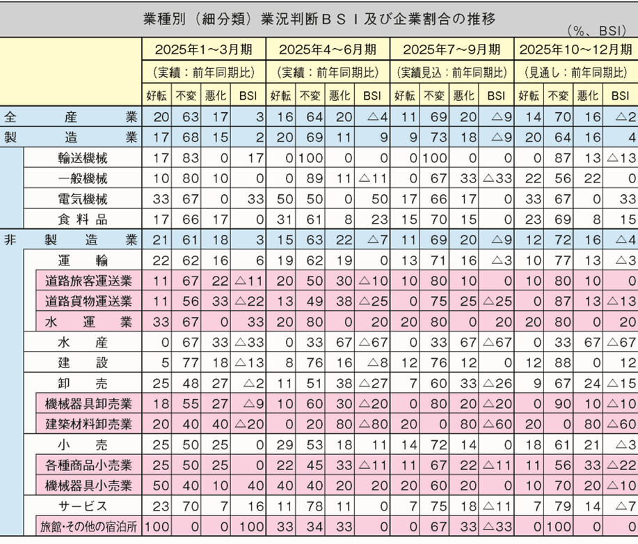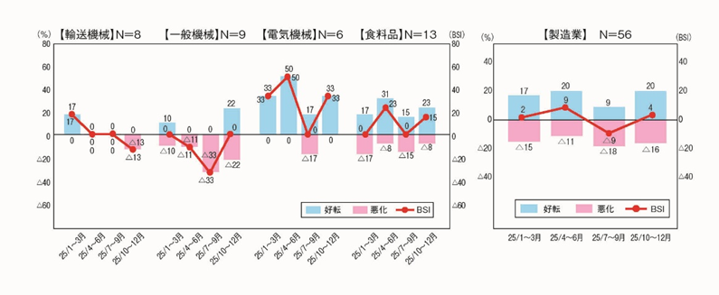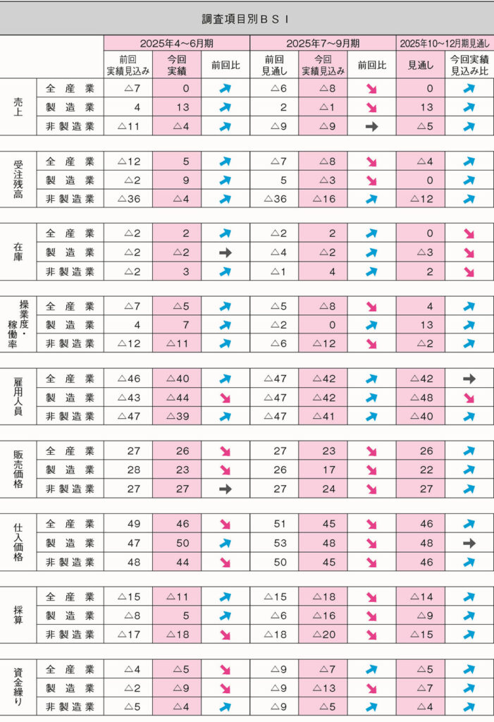 製造業の業況判断BSIは、4~6月期実績プラス9から、原材料やエネルギー価格の上昇に猛暑の影響、最低賃金の上昇懸念も加わり、足もと7~9月期は△9となる見込み。一方、先行き10~12月期は、受注環境の好転期待からプラス4と回復する見通し。