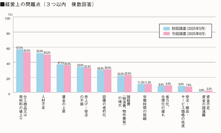 〇経営上の問題点(3つ以内の複数回答、全産業計)は、「仕入商品又は原材料価格の値上がり」が53.4%でトップ。これに「人材不足」(50.2%)と「賃金の上昇」(35.9%)が続くも、それぞれ前回調査(2025年5月)比減少している。