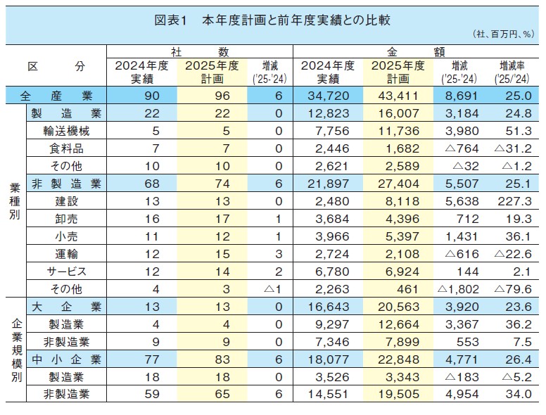 製造業・非製造業別では、製造業が160億円と、前年度実績128億円を24.8%上回っており、非製造業も計画額274億円と、前年度実績219億円を25.1%上回った。