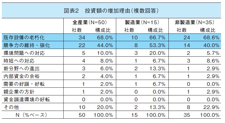 2025 年度投資計画額が、前年度実績に比べて増加する企業(50社)にその理由(複数回答)を尋ねると、「既存設備の老朽化」が68.0%と他を大きく引き離してトップ。次点は「競争力の維持・強化」の44.0%であった(図表2)。
