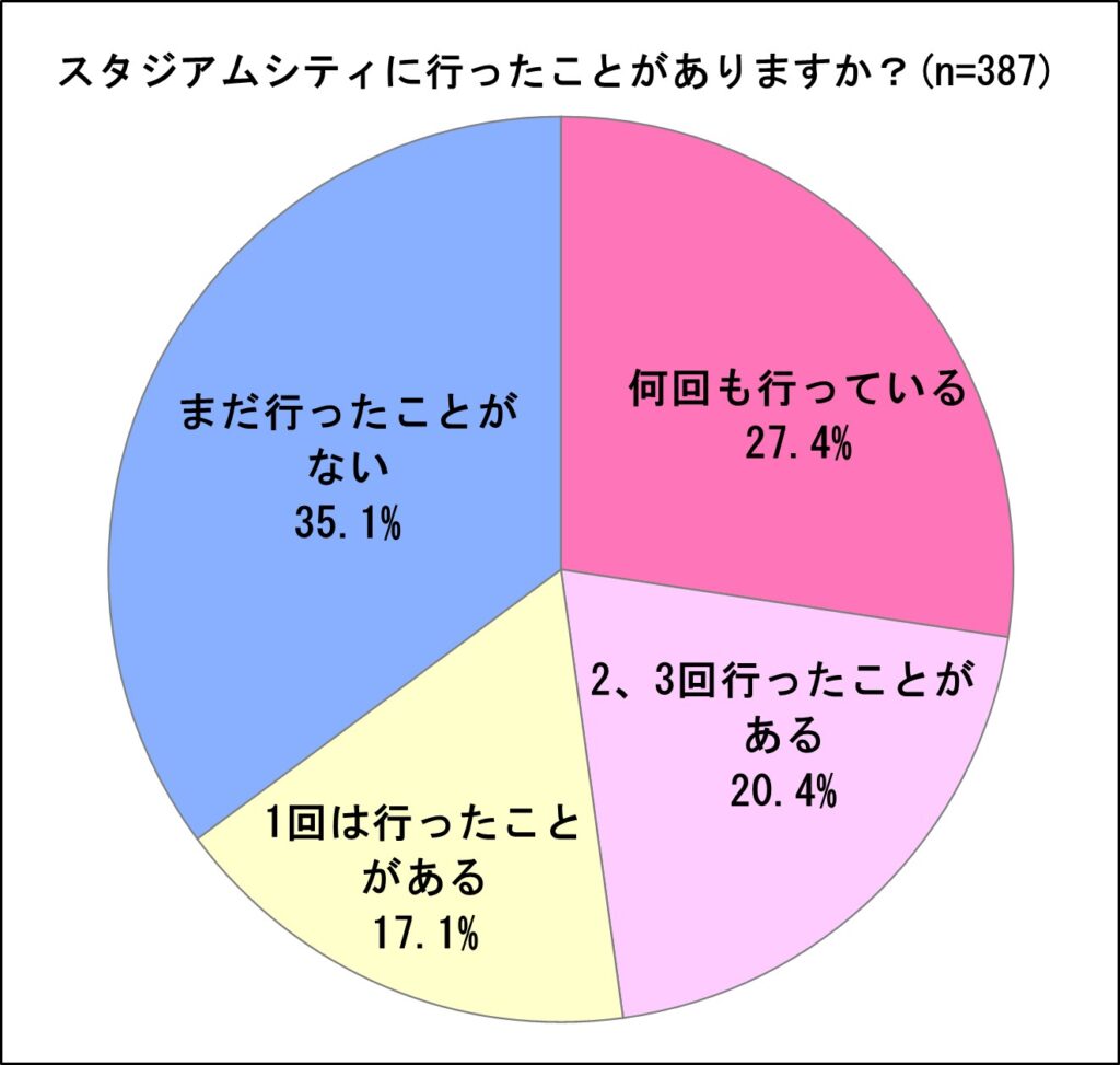スタジアムシティに行ったことがあるのかどうかを尋ねたところ、「何回も行っている」(27.4%)と「2、3回行ったことがある」(20.4%)、「1回は行ったことがある」(17.1%)とを合わせた『行ったことがある』との回答が64.9%と、6割を超えました。