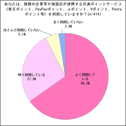 複数の企業等や加盟店が連携する共通ポイントサービスを利用しているか尋ねたところ「よく利用している」が65.2%、「時々利用している」が27.3%となり、合わせると9割超(92.5%)が「よく(時々)利用している」と回答しています。