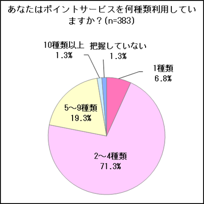 ポイントサービスを「よく(時々)利用している」と回答した方に、ポイントサービスを何種類利用しているか尋ねたところ、「2~4種類」の割合が71.3%と最も高く、以下「5~9種類」19.3%、「1種類」6.8%となりました。
