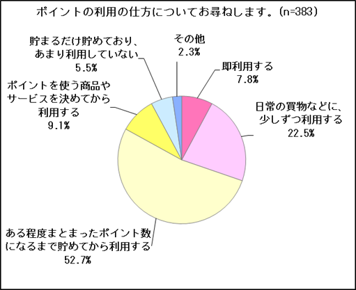 ポイントサービスを「よく(時々)利用している」と回答した方に、ポイントの利用の仕方について尋ねたところ、「ある程度まとまったポイント数になるまで貯めてから利用する」の割合が52.7%と最も高く、以下「日常の買物などに、少しずつ利用する」22.5%、「ポイントを使う商品やサービスを決めてから利用する」9.1%、「即利用する」7.8%となりました。