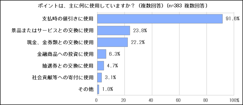 ポイントサービスを「よく(時々)利用している」と回答した方に、ポイントの利用の仕方について尋ねたところ「支払い時の値引きに使用」が91.6%と群を抜いています。以下「景品またはサービスの交換に使用」が23.8%、「現金、金券類との交換に使用」が22.2%となりました。