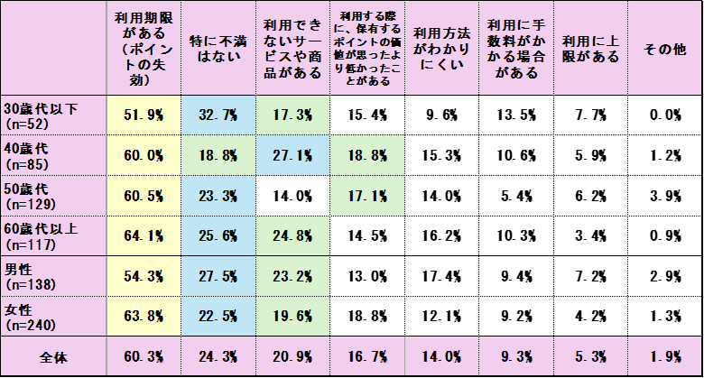 年代別でみると、全ての年代で「利用期限がある」(ポイントの失効)が5~6割台と多く回答されています。また、40歳代は、「特に不満はない」が1割台と他年代より少ない一方、「利用出来ないサービスや商品がある」が最も多く(27.1%)なっています。
