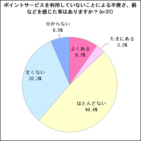 ポイントサービスを「ほとんど(全く)利用していない」と回答した方に、ポイントサービスを利用していないことによる不便さ、損などを感じた事があるか尋ねたところ、「ほとんどない」が48.4%、「全くない」が32.3%となり、合わせると8割超(80.7%)が「ほとんど(全く)ない」と回答しています。一方、「よくある」(9.7%)と「たまにある」(3.2%)を合わせた「よく(たまに)ある」との回答は、1割台(12.9%)でした。