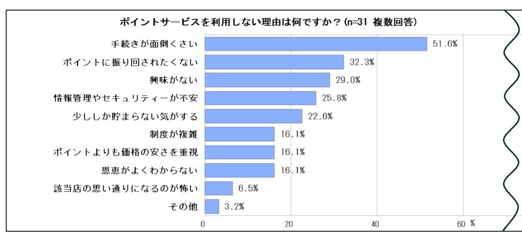 ポイントサービスを利用していない方は、「損得の考え方」より、むしろ「手続きの面倒くささ」が先行するようです。