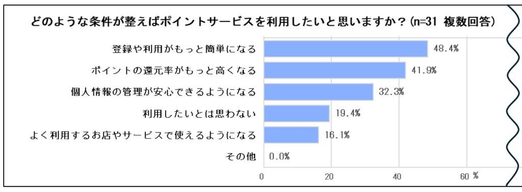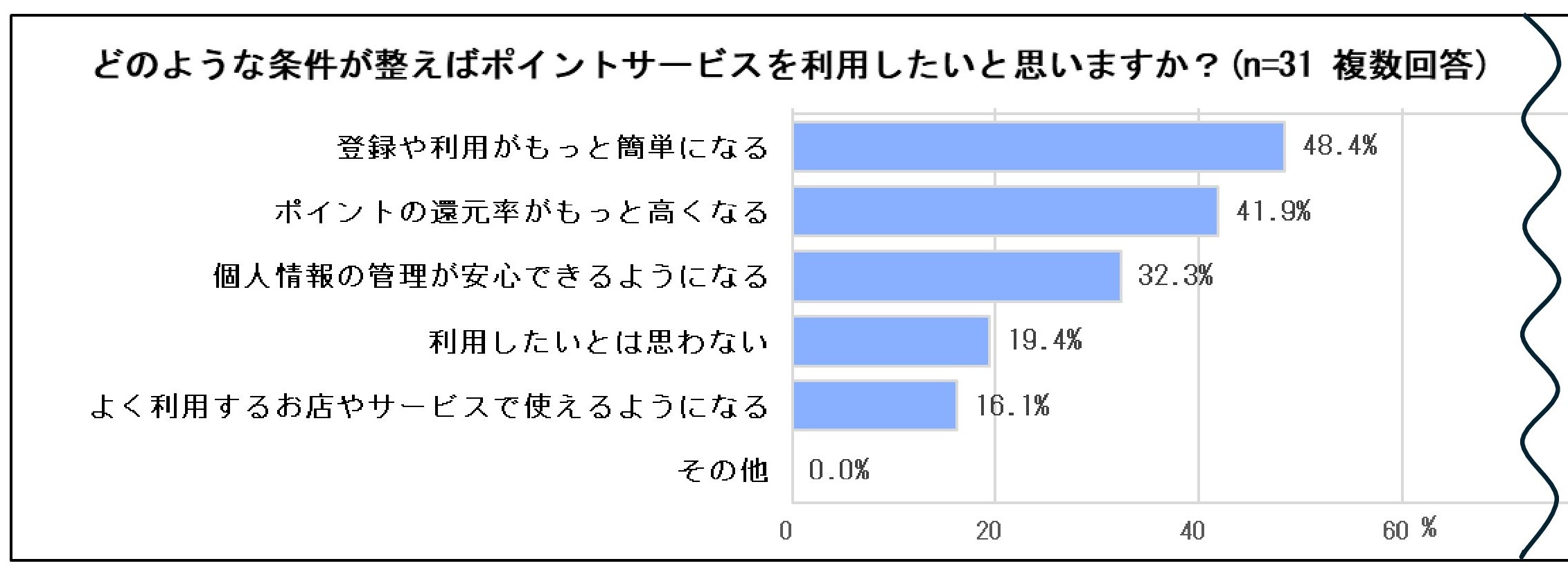 ポイントサービスを「ほとんど(全く)利用していない」と回答した方に、どのような条件が整えば、ポイントサービスを利用したいと思うかを尋ねたところ、「登録や利用がもっと簡単になる」が48.4%と半数近くとなり、以下「ポイントの還元率が高くなる」41.9%、「個人情報の管理が安心できるようになる」32.3%となりました。