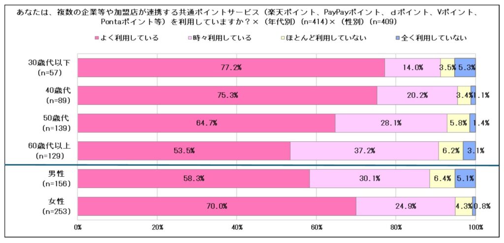 年代別では、30歳代以下と60歳代以上、性別では、女性の方がより多くのポイントサービスを使い分けていることが伺えました。