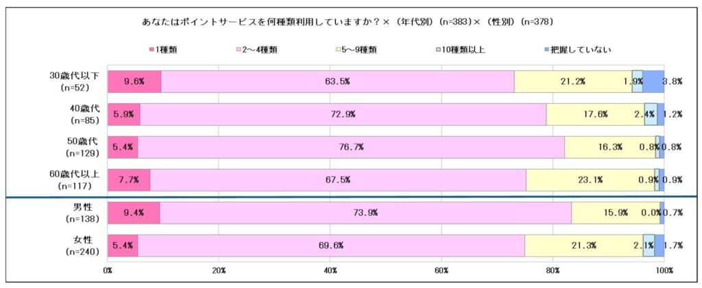 性別でも、男女ともに7割前後がポイントサービスの利用が「2~4種類」と最多となり、女性は「5~9種類」が2割を超えました。