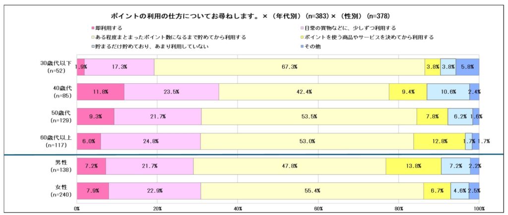 性別では、女性で、「ある程度まとまったポイント数になるまで貯めてから利用する」が55.4%と男性(47.8%)を上回っています。また、「ポイントを使う商品やサービスを決めてから利用する」は、男性が女性を上回り(男性:13.8%、女性:6.7%)ました。