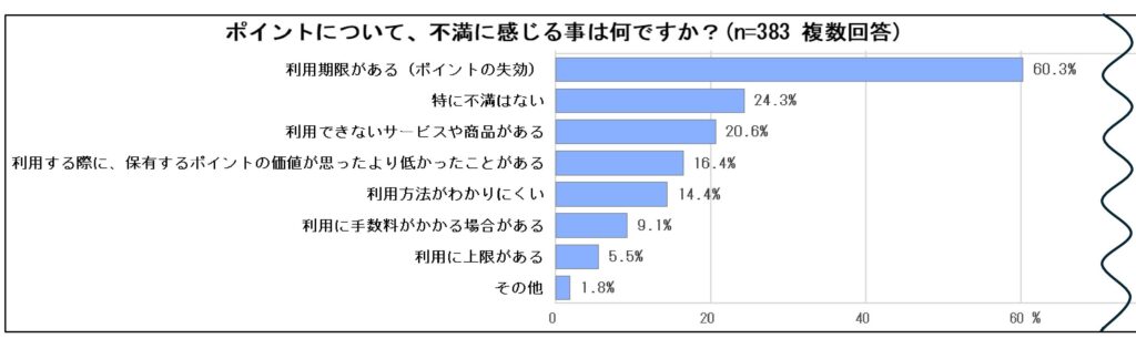 ポイントサービスを「よく(時々)利用している」と回答した方に、ポイントについて不満に感じることを尋ねたところ、「利用期限がある」(ポイントの失効)が60.3%と最も多く、以下「特に不満はない」が24.3%、「利用出来ないサービスや商品がある」が20.6%で続きました。