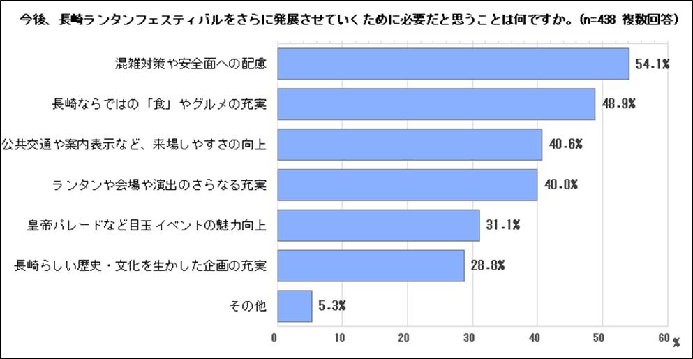 今後、長崎ランタンフェスティバルをさらに発展させていくために必要だと思うことを複数回答で尋ねたところ、「混雑対策や安全面への配慮」が54.1%と半数超を占めました。また、「長崎ならではの『食』やグルメの充実」についても48.9%と半数近くに上りました。