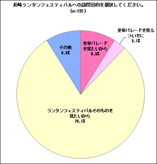 そこで、訪問目的を尋ねたところ、「ランタンフェスティバルそのものを見たいから」が79.1%と最も多く、長崎ランタンフェスティバルが地元・長崎の冬の風物詩としてすっかり市民に定着していることがうかがわれます。(「皇帝パレードを見たいから」は8.9%、「皇帝パレードを見るついでに」は3.1%に止まりました。)