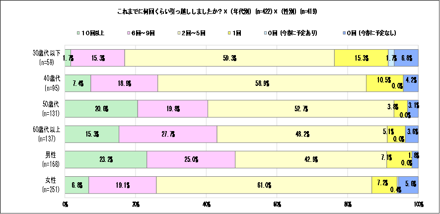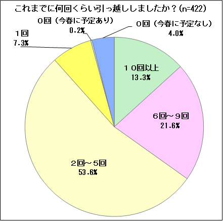 ◆ これまでに引っ越しした回数・・・「2回~5回」が5割強、「10回以上」も1割強