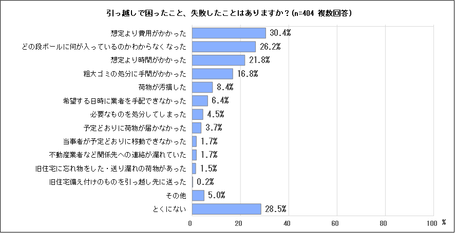 引っ越しで困ったこと、失敗したことがあるか尋ねたところ、最も多かったのは「想定より費用がかかった」(30.4%)、次いで「どの段ボールに何が入っているのかわからなくなった」(26.2%)、「想定より時間がかかった」(21.8%)、「粗大ごみの処分に手間がかかった」(16.8%)などとなっています。「その他」には、「旧居に忘れ物をして、そのまま失くしてしまった」、「荷物の紛失。予定の時間よりも業者が早く来たため荷物の確認が疎かになってしまった」などの意見がありました。