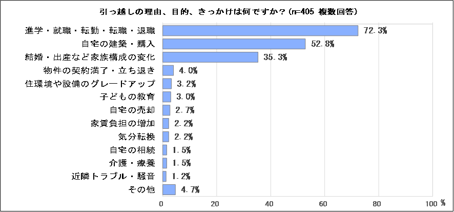 引っ越しの理由、目的、きっかけを尋ねたところ、最も多いのは「進学・就職・転勤・転職・退職」(72.3%)という進学や仕事に関わるもので7割強となりました。次に多いのも、「自宅の建築・購入」(52.8%)、「結婚・出産など家族構成の変化」(35.3%)というライフイベントに関わるものでした。