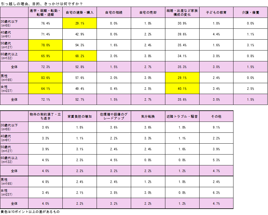 ◆ 引っ越しの理由、目的、きっかけ・・・「進学・就職・転勤・転職・退職」が7割強