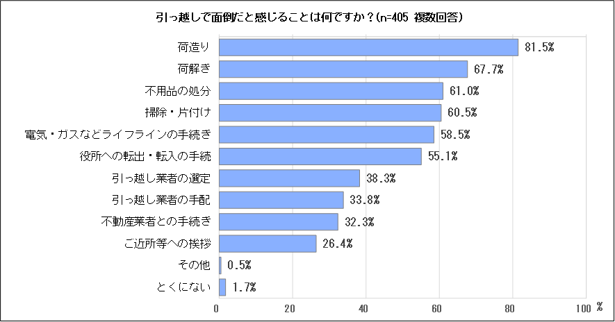 これらに次いで多いのは、「掃除・片付け」(60.5%)、「電気・ガスなどライフラインの手続き」(58.5%)、「役所への転出・転入の手続き」(55.1%)で5割を超えています。その他にも、「引っ越し業者の選定」(38.3%)、「引っ越し業者の手配」(33.8%)、「不動産業者との手続き」(32.3%)、「ご近所への挨拶」(26.4%)といろいろ面倒に感じることがあるようです。