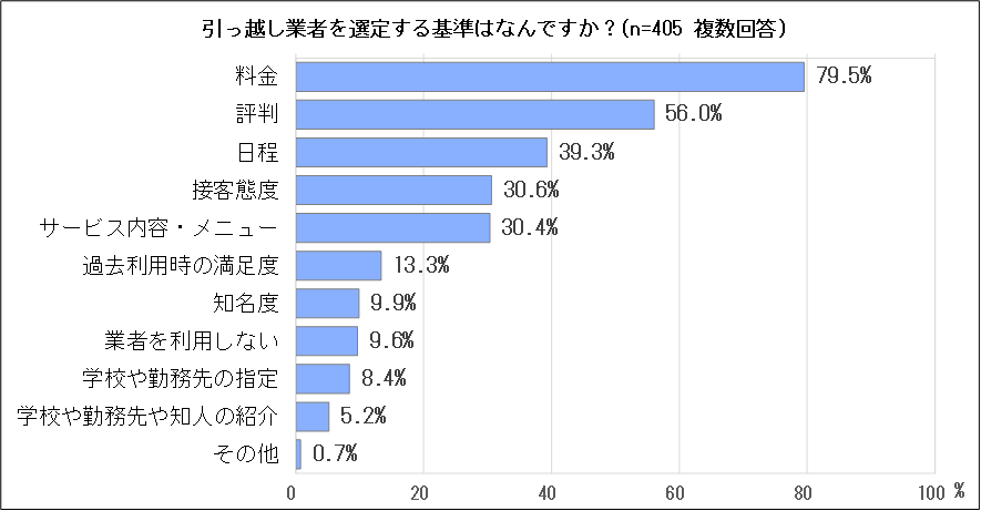 引っ越し業者を選定する基準が何か尋ねたところ、最も多いのは「料金」(79.5%)で約8割、次いで「評判」(56.0%)が約6割です。以下、多い順に「日程」(39.3%)、「接客態度」(30.6%)、「サービス内容・メニュー」(30.4%)となっています。