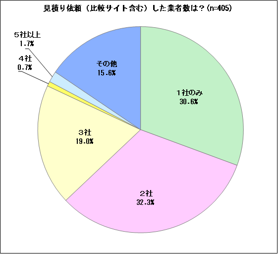 見積り依頼(比較サイト含む)した業者数を尋ねたところ、「2社」(32.3%)と「1社のみ」(30.6%)が約3割、次いで「3社」(19.0%)が約2割です。「4社」と「5社以上」はわずかです。