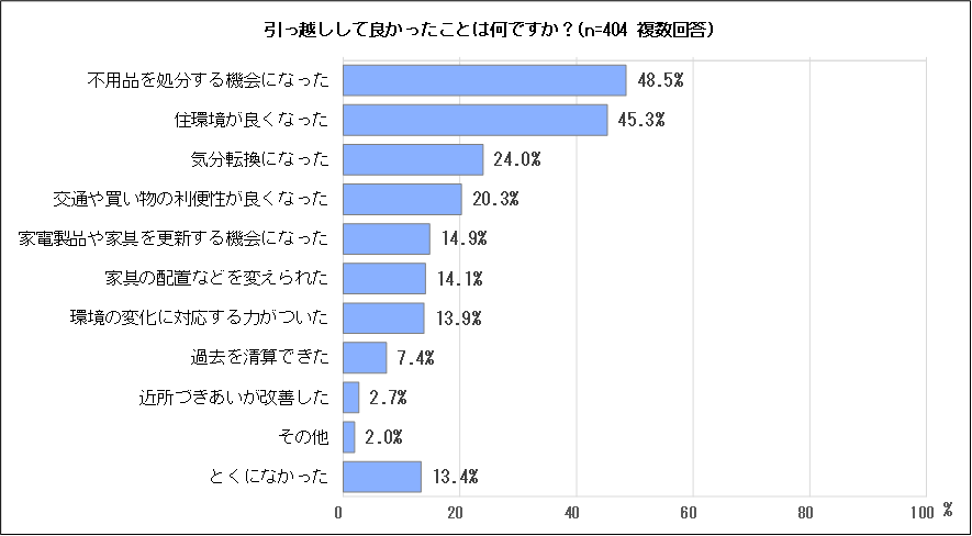 引っ越しして良かったことは何か尋ねたところ、「不用品を処分する機会になった」(48.5%)と「住環境が良くなった」(45.3%)がいずれも5割近くとなっています。次いで、「気分転換になった」(24.0%)、「交通や買い物の利便性が良くなった」(20.3%)などとなっています。